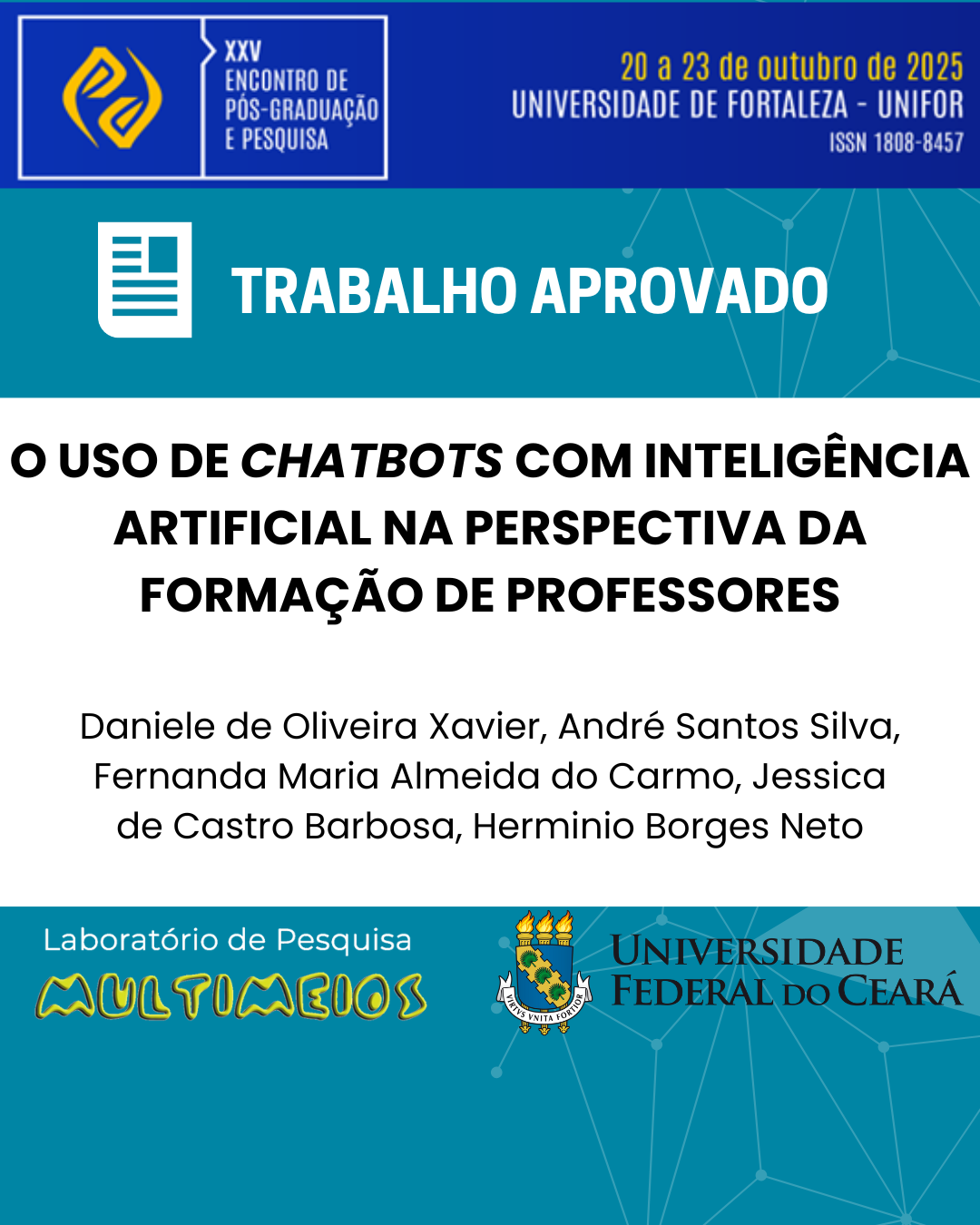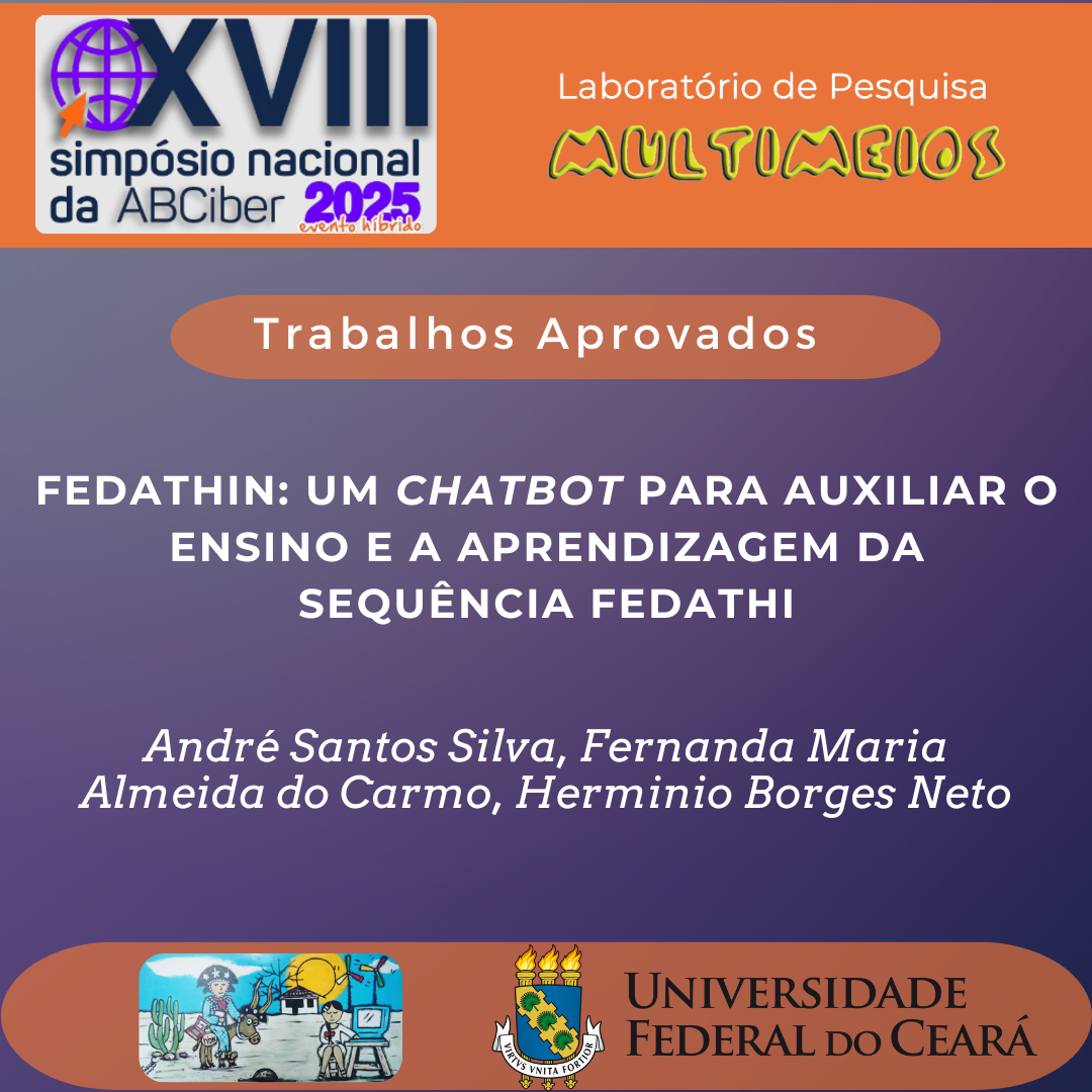 Tivemos um trabalho aprovado nos Encontros Científicos 2025 da UNIFOR. Nele, escrevemos brevemente sobre nossa exploração de uso de diversos chatbots nos últimos três anos e apresentamos um esboço do nosso chatbot Fedathin.