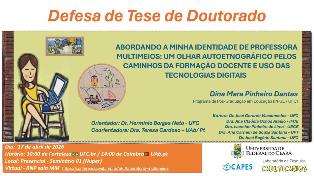 No dia 17 de abril de 2026, próxima sexta-feira, às 10h do Brasil e às 14h de Portugal, Dina Mara defenderá sua pesquisa de doutorado. O trabalho está intitulado “Abordando a minha identidade de professora multimeios: um olhar autoetnográfico pelos caminhos da formação docente e uso das tecnologias digitais”.