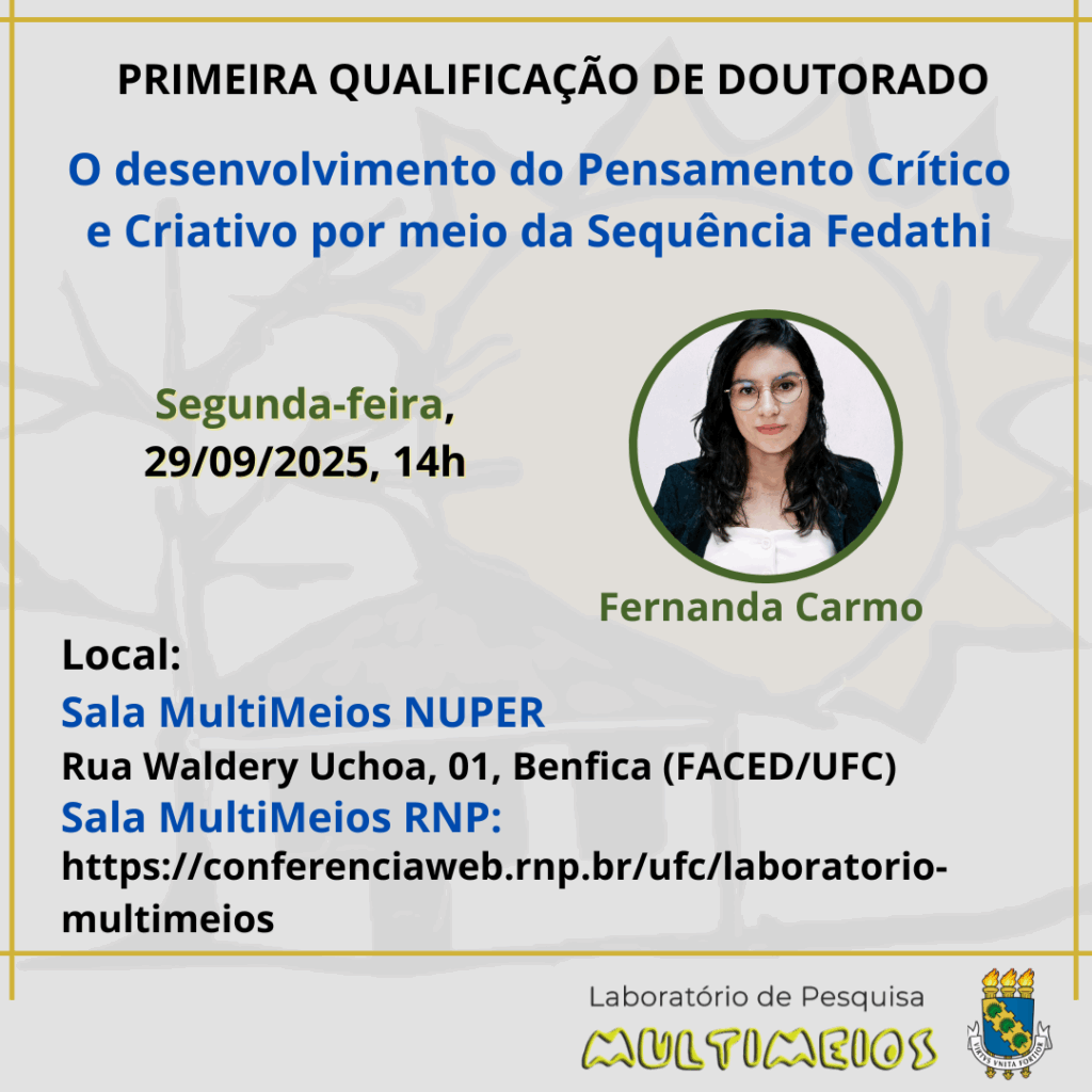 A primeira qualificação de doutorado de Fernanda Carmo ocorrerá no dia 29/09/2025, segunda-feira, às 14h. O tema do estudo é O desenvolvimento do Pensamento Crítico e Criativo por meio da Sequência Fedathi.
